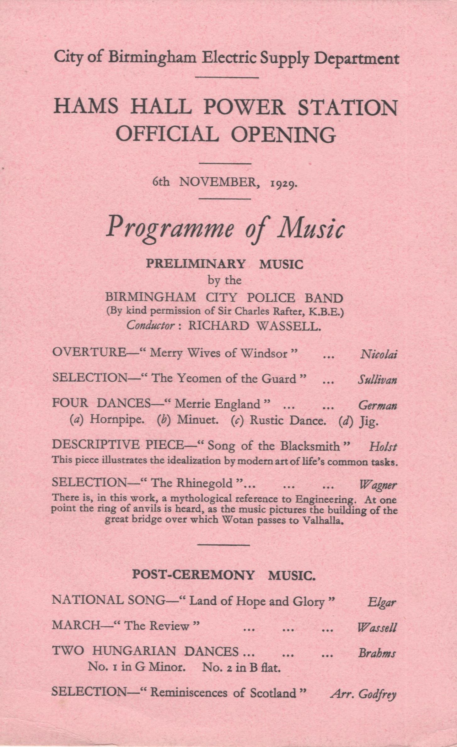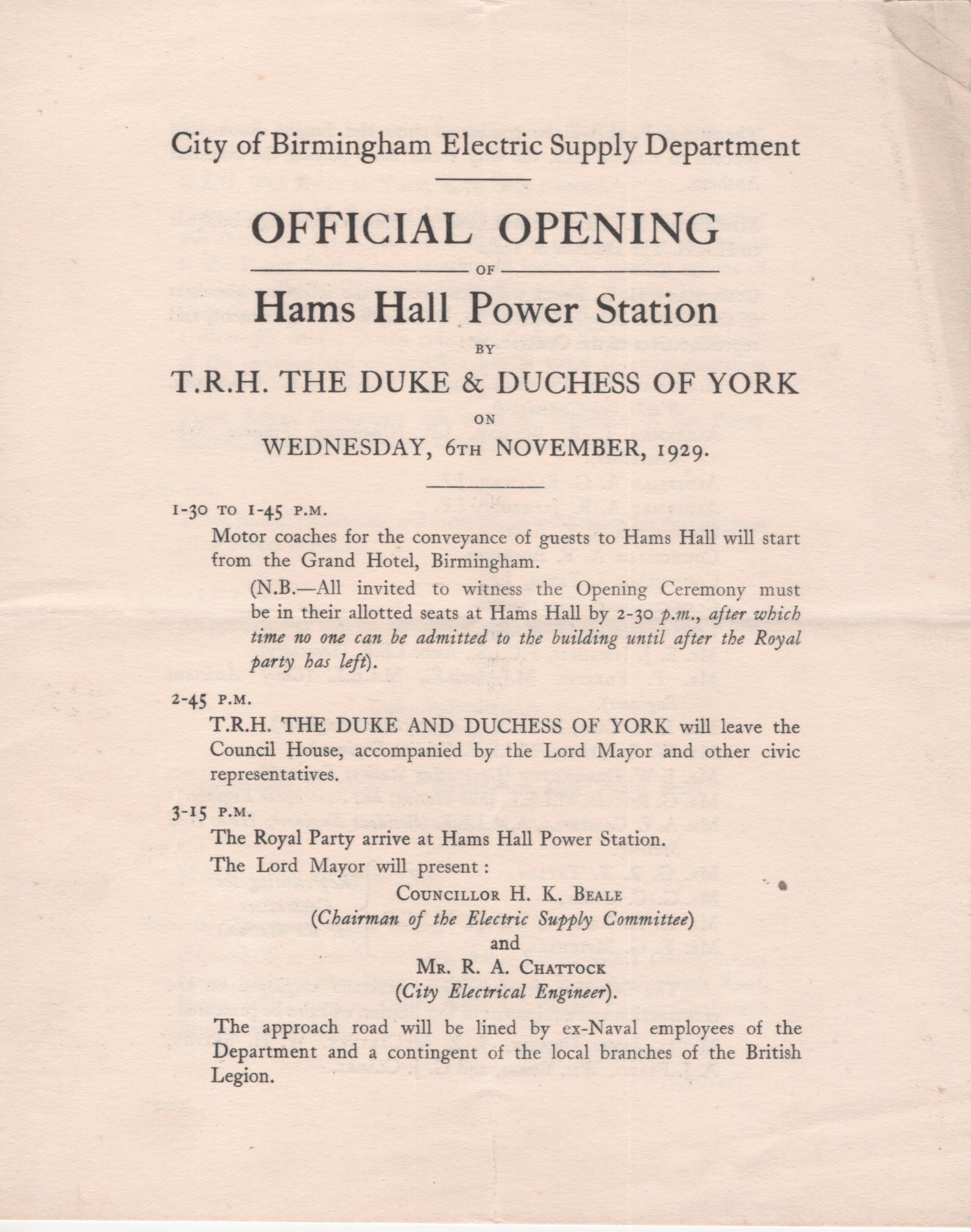 To celebrate the opening of Hams Hall A Power station, a concert was held on 6th November 1929. The main guests were the Duke & Duchess of York, accompanied by the Lord Mayor of Birmingham. The approach road was lined by ex-naval employees of the City of Birmingham Electric Supply Department as well as representatives of the British Legion.